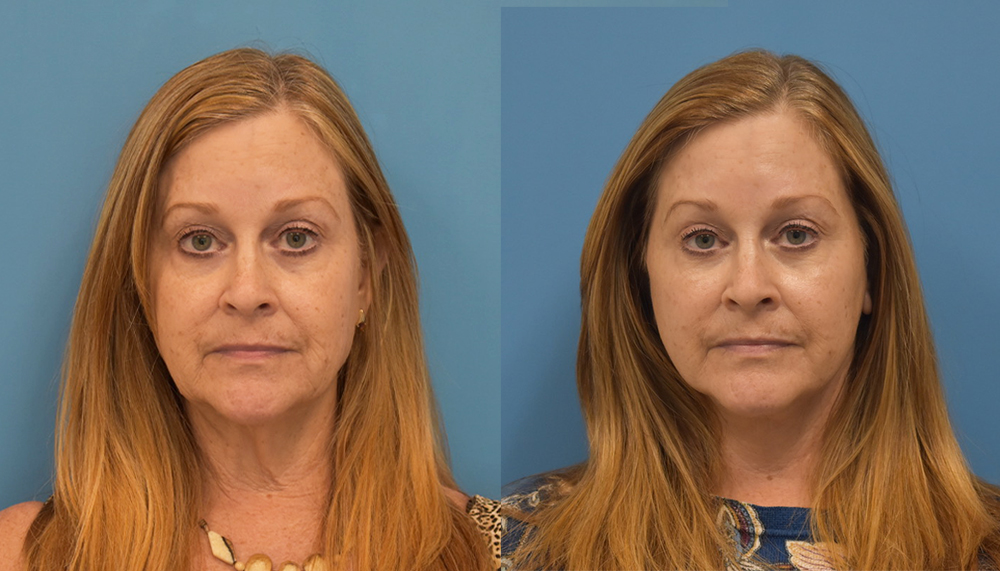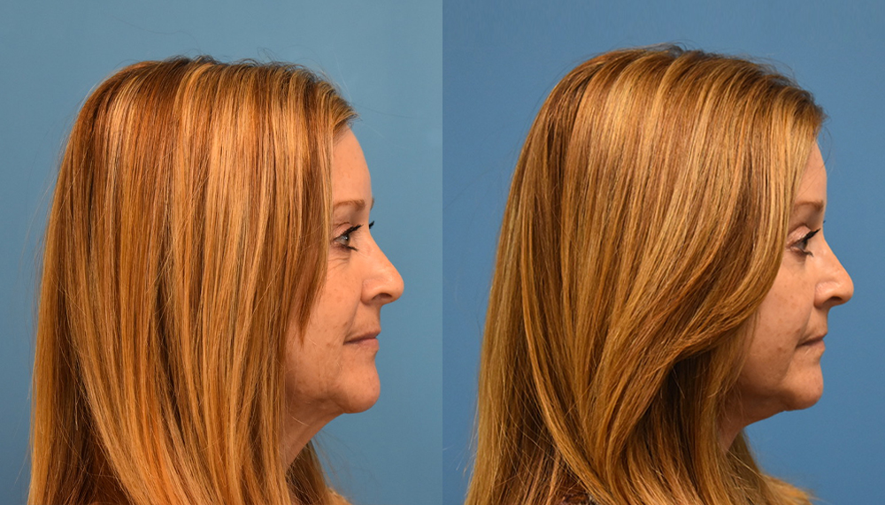 This patient in her fifties came to me after having less invasive procedures over the years. She was interested in additional improvement along her jawline and her eyelids.